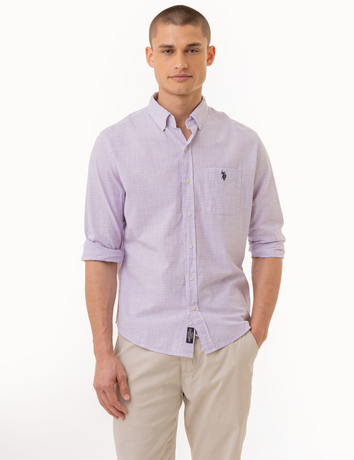Our LONG SLEEVE HORIZONTAL STRIPE WOVEN SHIRT features an elegantly crafted horizontal stripe pattern, and a branded patch near the hemline that perfectly complements the shirt. The buttoned front closure and long-sleeves are designed with sophistication, while the shirttail hemline adds to the shirt’s exclusive character. A patch pocket on the chest with an embroidered logo completes the piece. Model is wearing a size Medium.