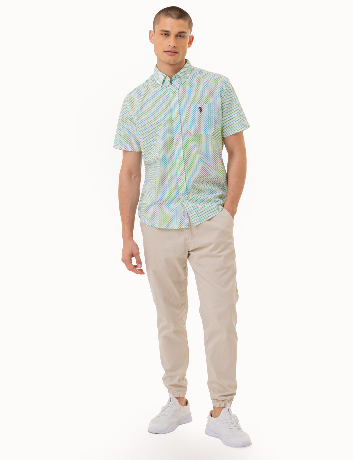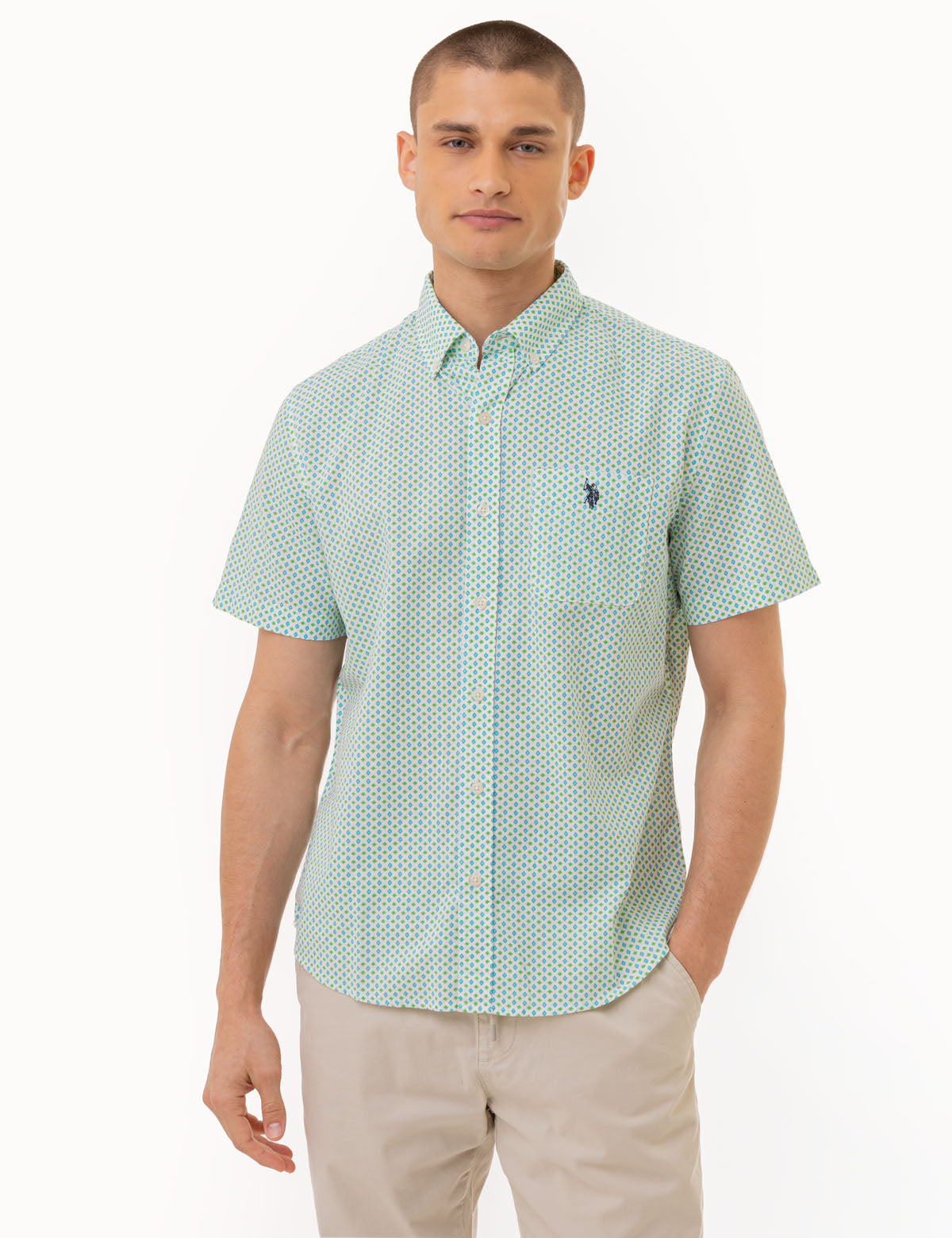 SHORT SLEEVE DIAMOND PRINT WOVEN SHIRT